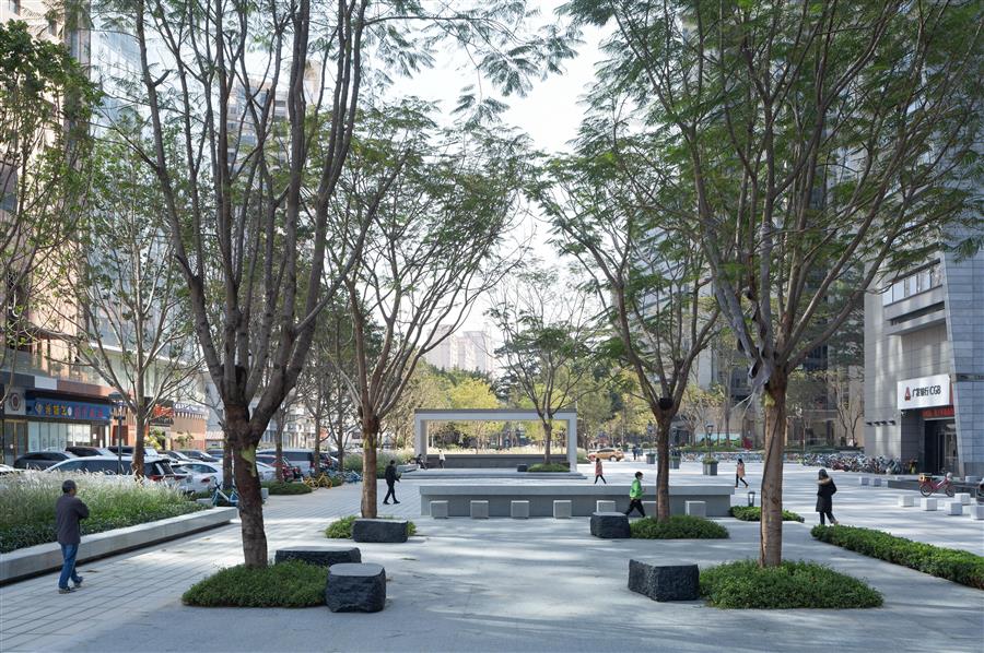 AUBE 欧博设计通过重点打造两条全新景观轴线,缝合、激活片区公共空间。自然活力轴创造生态自然街区,营造复合性功能场所,吸引人气,创造活力。设计通过保留现状长势良好的树木,在林下增加休憩活动空间,在硬质区域增加特色开花乔木和雨水花园,融入绿色生态理念和海绵城市生态功能,聚集人气、提升街区价值和活力。