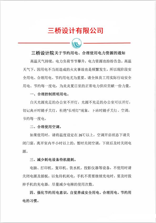 三桥设计院关于节约用电、合理使用电力资源的通知