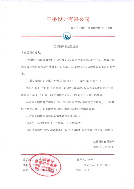 感谢您一直以来对我们的信任和支持,在这个举国欢庆的日子,三桥设计院祝各分公司负责人及全体员工节日快乐!现将我们国庆节的放假安排通知到大家: