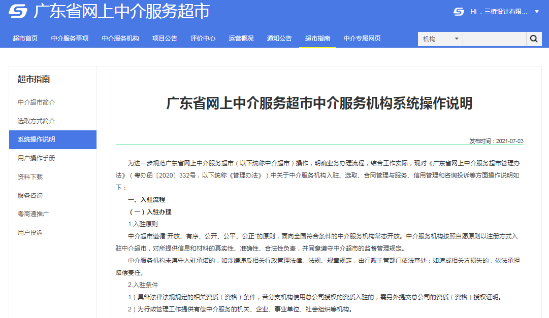 广东省网上中介服务超市是由省统一规划、统一建设、统一部署,是全省各类有关中介服务网上交易的综合性信息化服务和信用管理平台,为项目业主购买中介服务、中介服务机构承接中介服务项目行业主管部门对相关单位和人员实施监管提供服务。